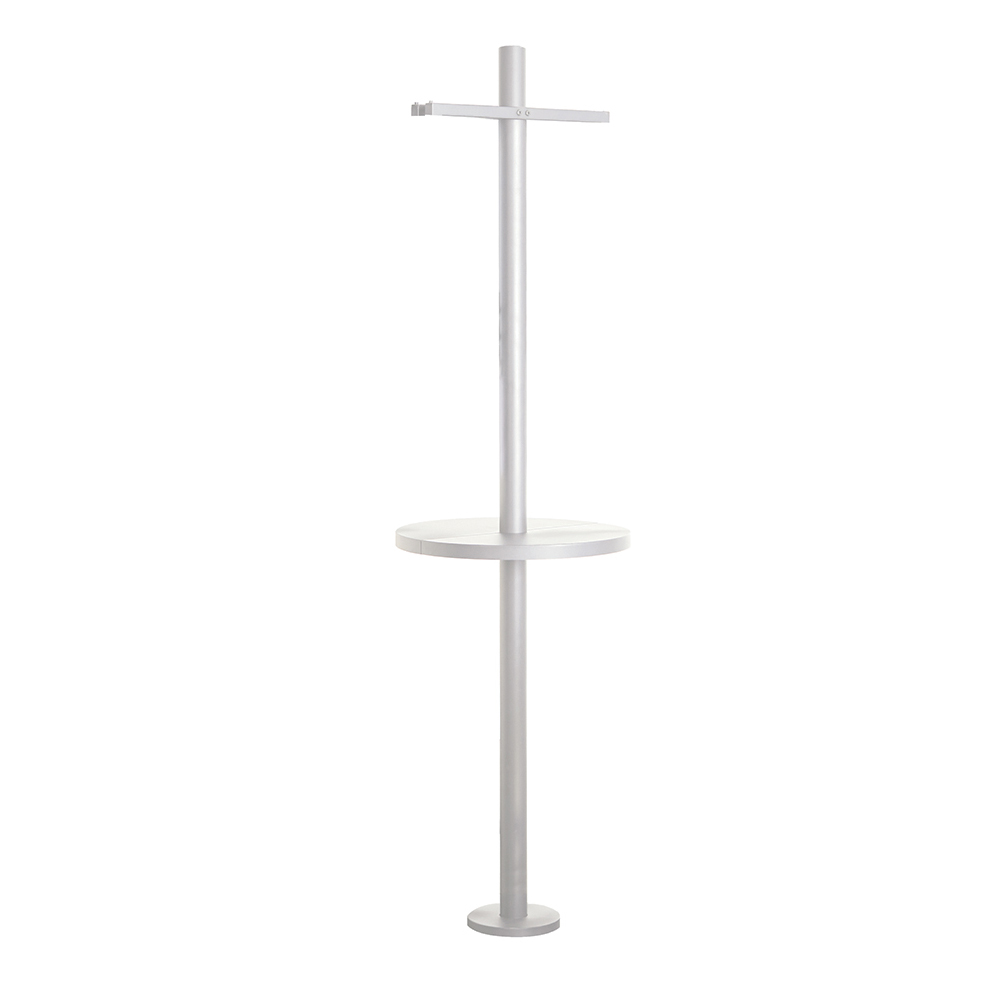 The hollow pole allows you to bring power up from the floor and connect your LED mirror option or simply powering your tools through the central pole. Made out of solid powder coated metal in a matte look, bolt it to the floor or to the base plate, and create a contemporary styling station where you can mount selected Comfortel mirrors on each side.
